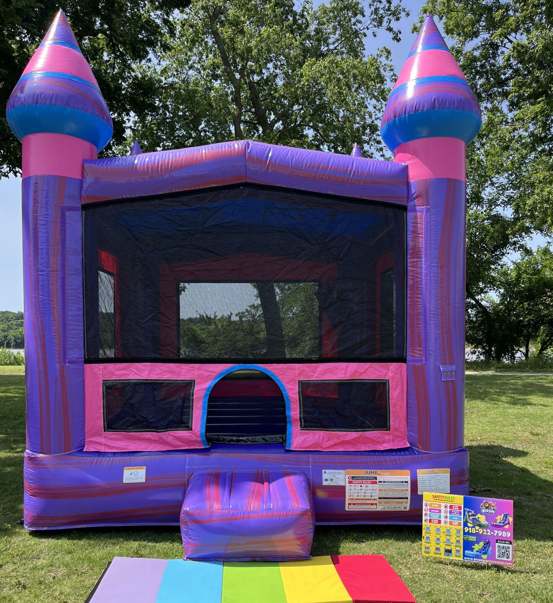 The Pink 13′ X 13′ Bounce House is a posh playhouse! True to its name, it’s mostly purple with pink blended in. A basketball hoop is also inside to complement the ample bouncing space. Made with lead-free 15 oz. PVC vinyl, this unit is a reliable inflatable for parties and events!